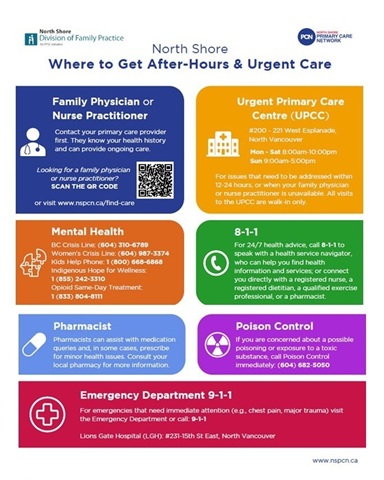 Thanks to the North Shore Primary Care Network for this poster on where to get after hours and urgent care. Source: https://nspcn.ca/find-care/